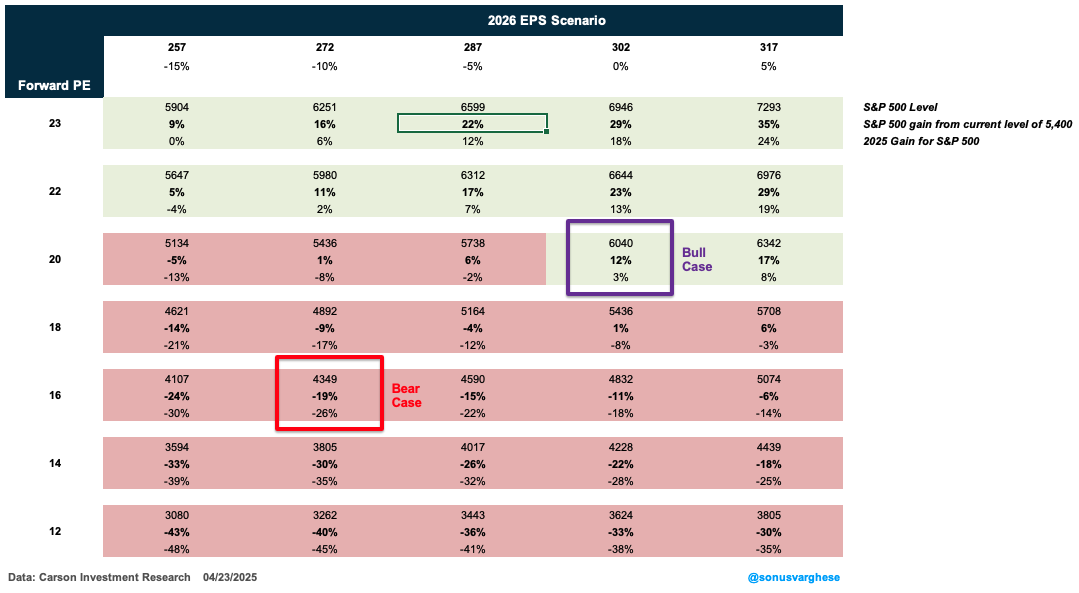 Also, household and corporate balance sheets are in reasonable shape and not as leveraged as they were in 2007. So, we should be able to avoid a financial crisis, a la a 2008-style meltdown in markets and the economy. We could see 2026 EPS downgraded by about 10% (from $302/share to $272/share), and P/E ratios fall to about 16x (near the historical average). That would bring the S&P 500 level to about 4,349, which is 19% below where we are now and would represent a 26% decline for the index in 2025. Like I said, this is the bear case amid a lot of uncertainty, so it makes sense that we would end up in a bear market.