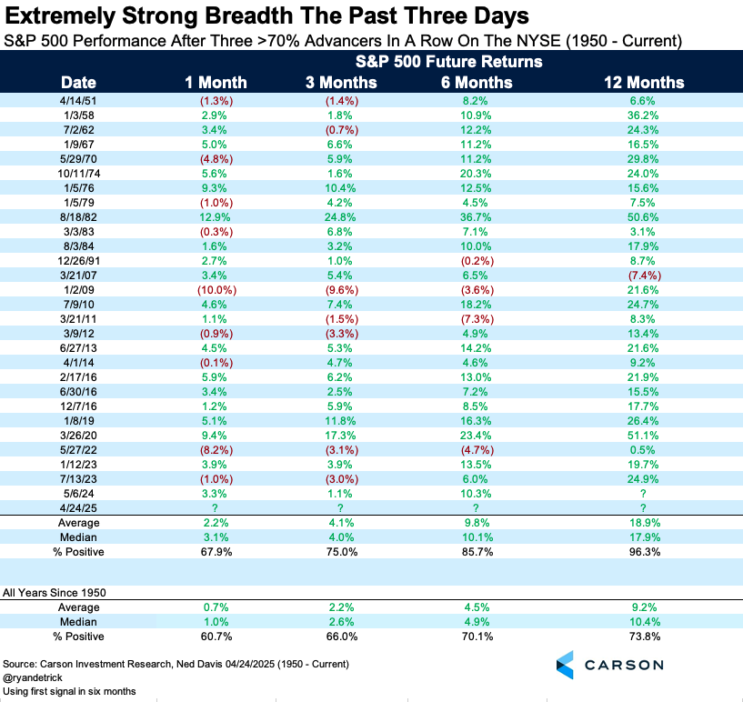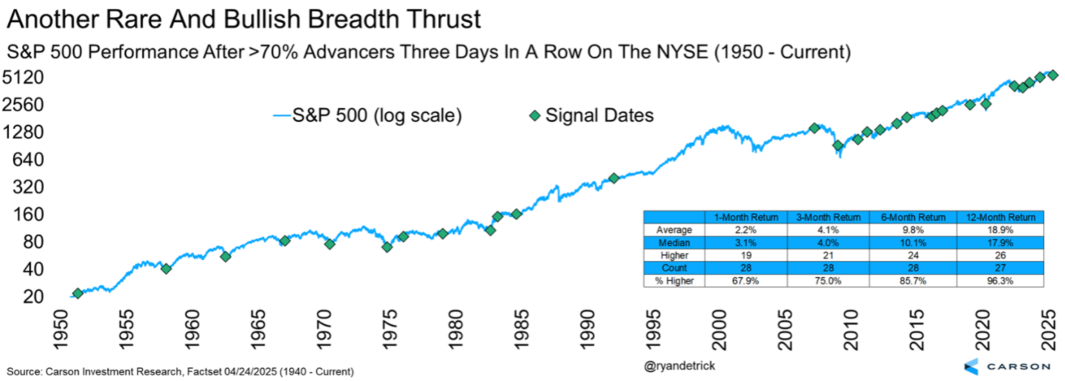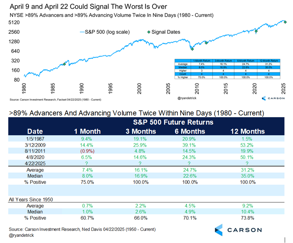 Dates like the lows in 1982, 2009, and 2020 show up this time, which always catches our attention. The next six months were never lower and up more than 14% on average; the next year higher every time and up more than 22% on average. Those numbers could have bulls smiling later in 2025.