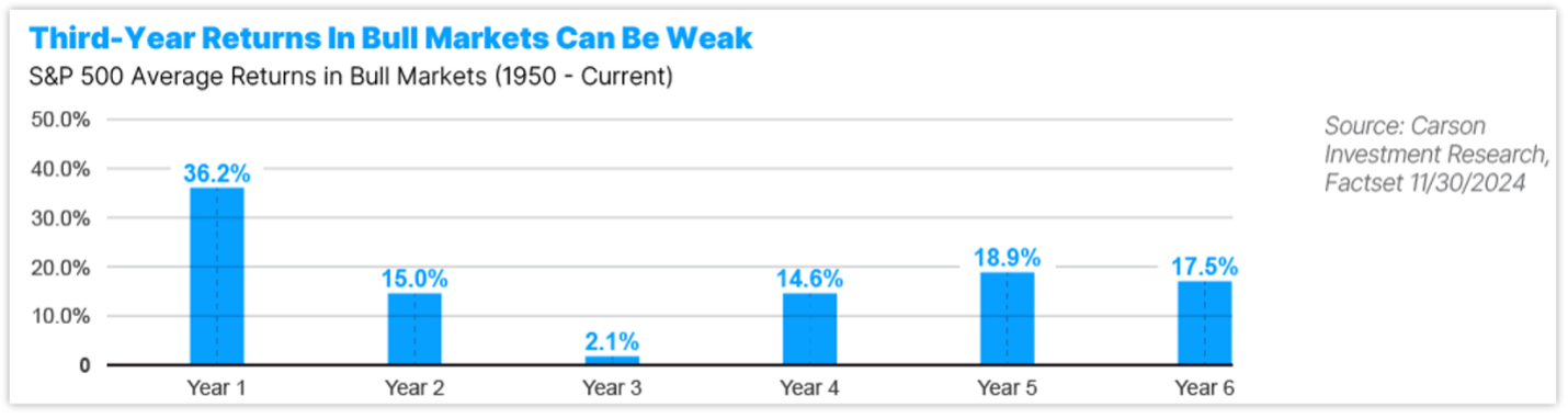 Note that a near 5% return for 2025 would be par for the course for the third year of a bull market, where average returns have been close to 2%.
