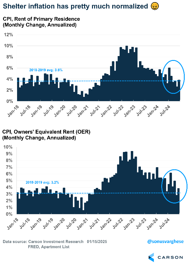 Shelter inflation is inching ever closer to the pre-pandemic average. And there’s likely more disinflation in the pipeline, as we discussed in our 2025 Outlook. Apartment List reports that median rents are down 0.5% y/y, the 19th straight month with a negative y/y reading.