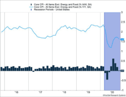 Initial unemployment claims continue to trend lower, dropping to 709,000 last week. Inflation remains well controlled. The Consumer Price Index has risen just 1.2% over the last 12 months. Core inflation, which excludes food and energy, was basically unchanged [Figure 1] and reflects weak underlying price pressures. Medical costs, shelter, and tuition saw a slower rate of price increases or outright price declines.