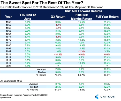 The S&P 500 gains an average of 4.3% the first half of the year, which makes the 5.5% gain in the first half of 2025 better than an average year. We found that years that were up 5–10% at the midpoint of the year actually tended to do quite well the rest of the year, higher a very impressive 13 out of 15 times and up 6.4% on average, better than the average final six months of 4.8%.