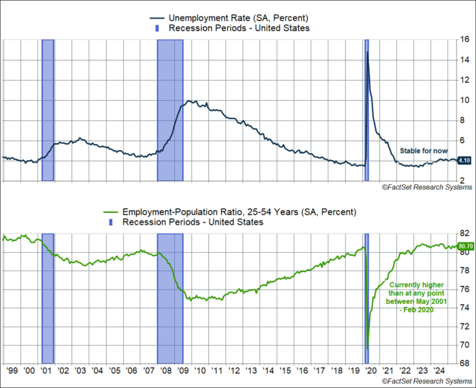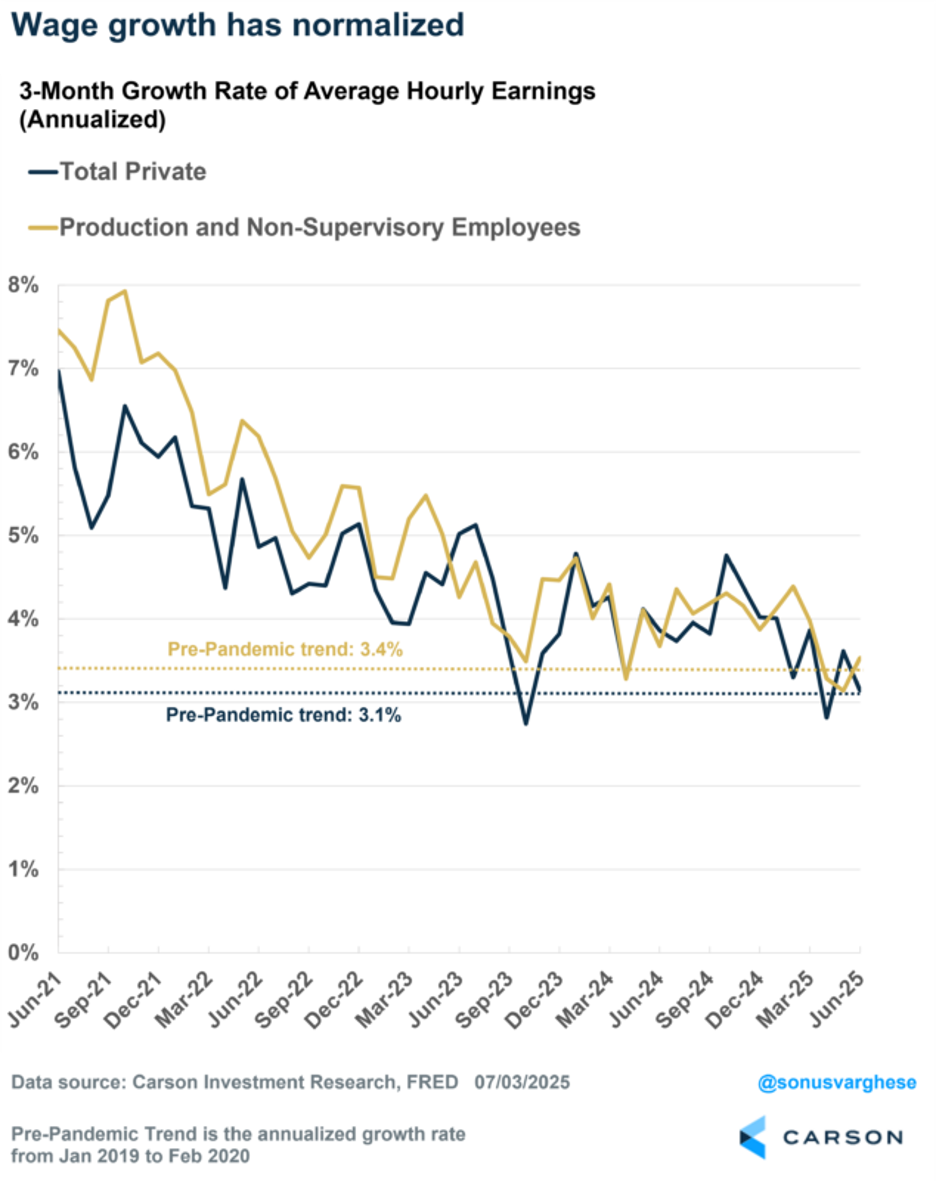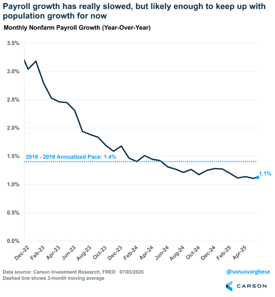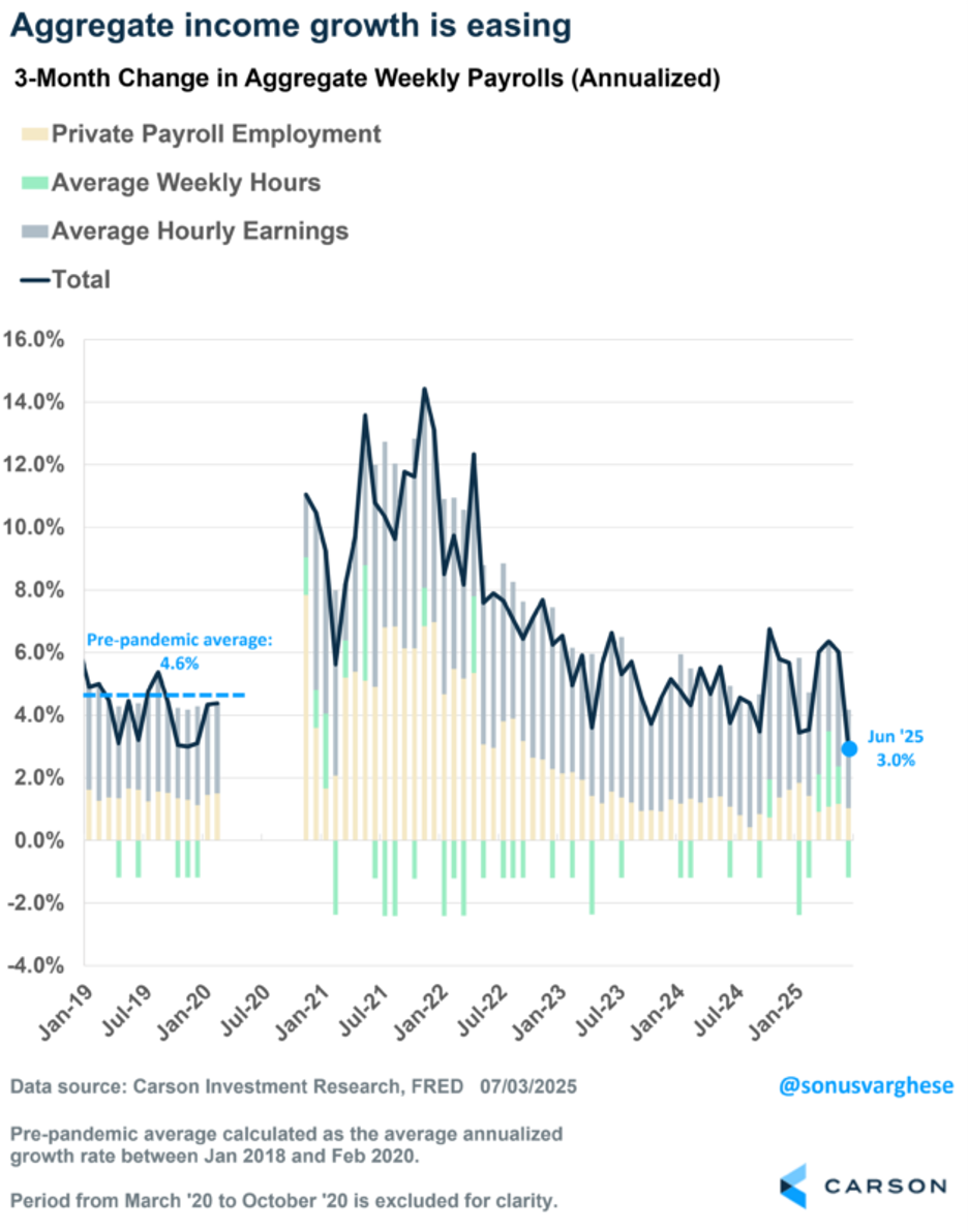 The big picture is that the labor market is cooling, with slowing job growth and wage growth, and that’s driving aggregate income growth. That will likely pull down the rate of economic growth to something like 1–2%, especially since cyclical areas like manufacturing and housing are also a drag on growth right now thanks to tariff uncertainty and elevated rates. By no means is this recessionary, but the economy is clearly slowing. For any sort of acceleration going forward we need a catalyst, whether from fiscal or monetary policy.