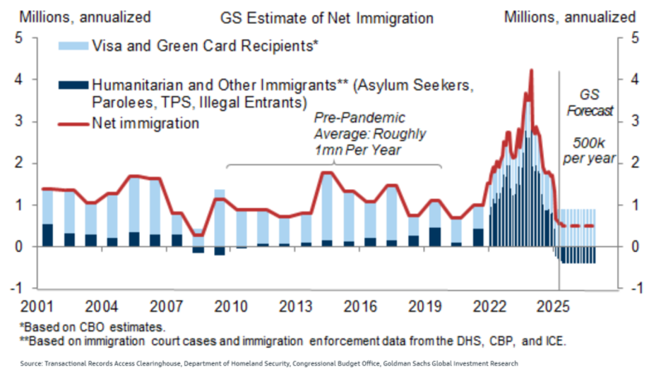 Immigration has slowed to an annualized pace of around 600,000, about a third lower than where it was in Q4 2024. And we’d already started seeing a slowdown after mid-2024, on the back of a big drop in unauthorized immigration, which has gone into reverse this year (with deportations). Analysis from Goldman Sachs suggests net immigration may slow even further to around 500,000 by year-end. It was running over two million between 2022 and 2024—there’s a reason why payroll growth averaged about 254,000 a month during those three years. The economy basically had to create that many jobs to keep up with population growth. Of course, this also drove aggregate income growth well above the pre-pandemic trend, which in turn drove real GDP growth close to 3% annualized in 2023–2024.