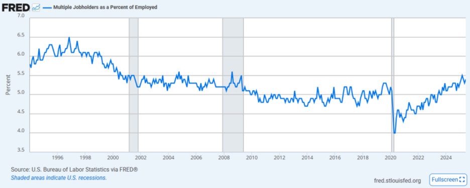 We do want to caution that none of this implies the labor market is breaking down. In fact, the ranks of multiple job holders is growing, which is positive, as this would happen only if the economy was creating more jobs, and workers can actually find more than one job. Multiple jobholders are now 5.4% of those employed, which is higher than it was at the end of last year (5.2%).