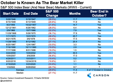 The timing is also potential good news. While October has a reputation for crashes, it is really a bear market killer. Of the past 17 bear (or near bear markets), stocks bottomed in October six times. Could it happen again? With sentiment this pessimistic and extremely positive seasonals right around the corner, we’d be open to it.