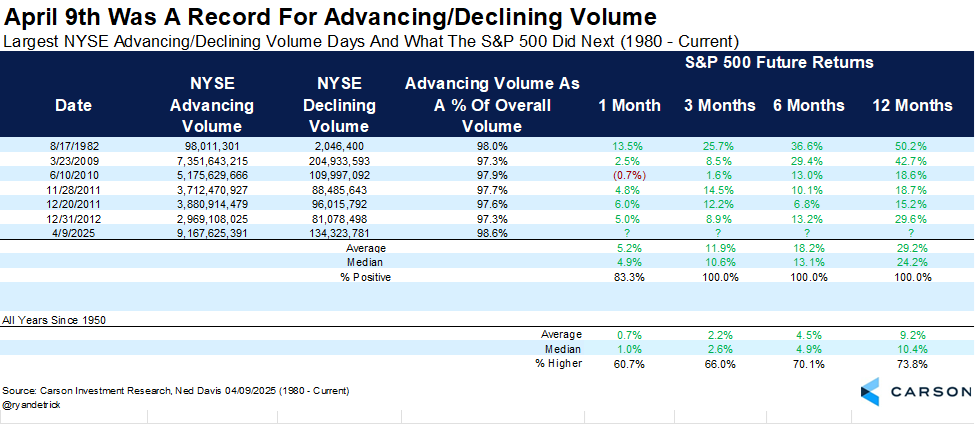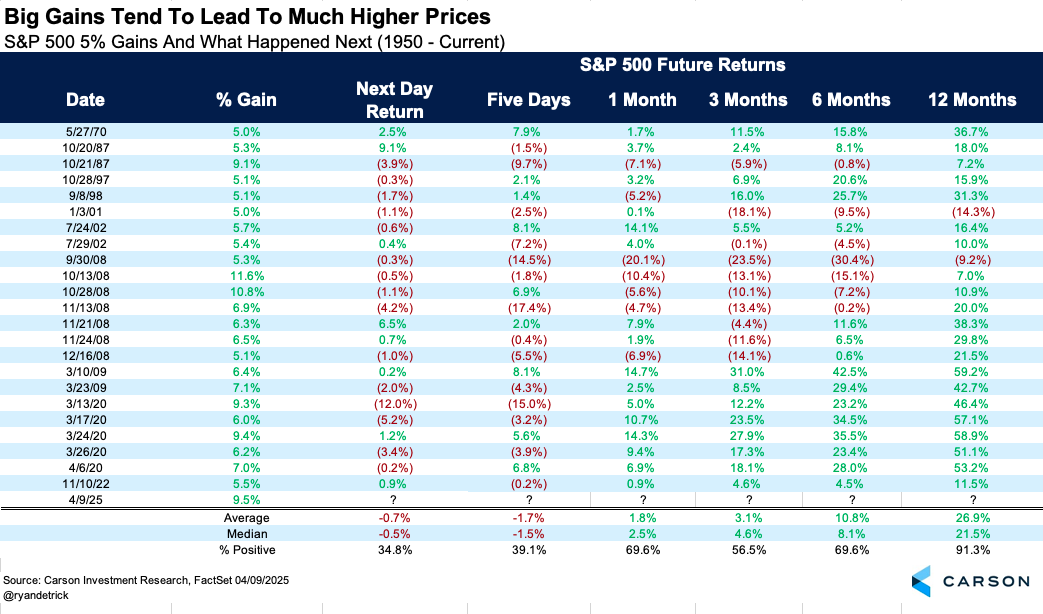 President Trump put a pause on all reciprocal tariffs (excluding China) for 90 days and the S&P 500 responded by gaining 9.5% in one day, the third best single day since World War II. Like a beach ball under the water, once it gets some momentum, it can really start moving. In fact, we found 23 other times (since 1950) the S&P 500 gained more than 5% in one day and the future returns were quite impressive longer term, with stocks up a year later more than 91% of the time and up nearly 27% on average.