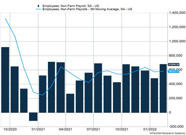 Before commenting on Ukraine, let’s focus on the good news. The U.S. establishment survey estimated the economy added 678,000 jobs versus the expectation of a 400,000 gain, and the previous two months were revised higher by a combined 92,000 jobs. The U.S. added 1.15 million jobs in the first two months of the year, which is even more impressive considering the Omicron variant peaked in January. With these additions, the economy has regained about 90% of the jobs lost in March and April 2020, which is encouraging but shows many unfilled positions remain.