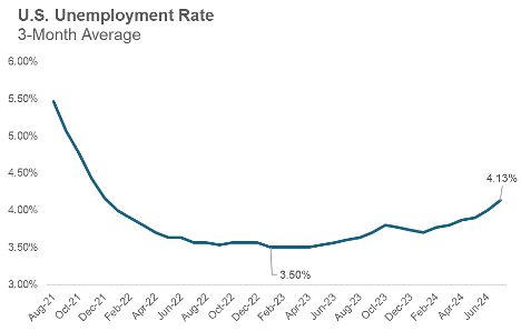 Friday’s non-farm payroll number missed expectations at only 114,000 jobs versus expectations of 175,000, with the prior month revised lower as well. Healthcare and government, which had dominated prior reports, showed less of an impact in July. While 114,000 jobs created was below expectations, the number was still positive and not the lowest we’ve seen in the past year (April came in at 108,000 jobs). There are also indications that hurricane Beryl impacted the number based on how the data is collected. Lastly, the increase in construction jobs was interesting, coming in at a solid 25,000 jobs added.
