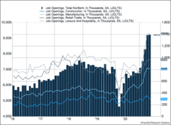 The U.S. economy is nearly fully open. As larger cities and coastal states continue to open up, the demand for service workers has expanded. Restaurants and hotels are adding staff and, based on the job opening data shared above, wish they could hire even more. Travel data is improving. Movie theaters are reopening. However, many people are still struggling. The first fired are often the last rehired, and 30% of unemployed workers have been out of work for more than one year.