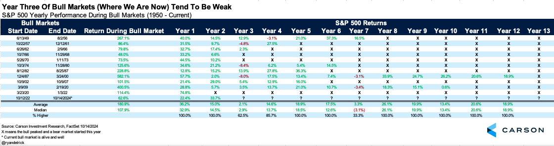 As we noted in our 2025 Outlook: Animal Spirits, stocks usually see huge gains the first two years of a bull market (just like they did this time) and the third year can be more choppy and frustrating. Although we expect stocks to do much better than the average third year gain of 2.1%, this is still something to consider a potential issue. End of the day, after the huge gains we saw two years off of the October 2022 lows, it would be perfectly normal to see some consolidation at some point in 2025.