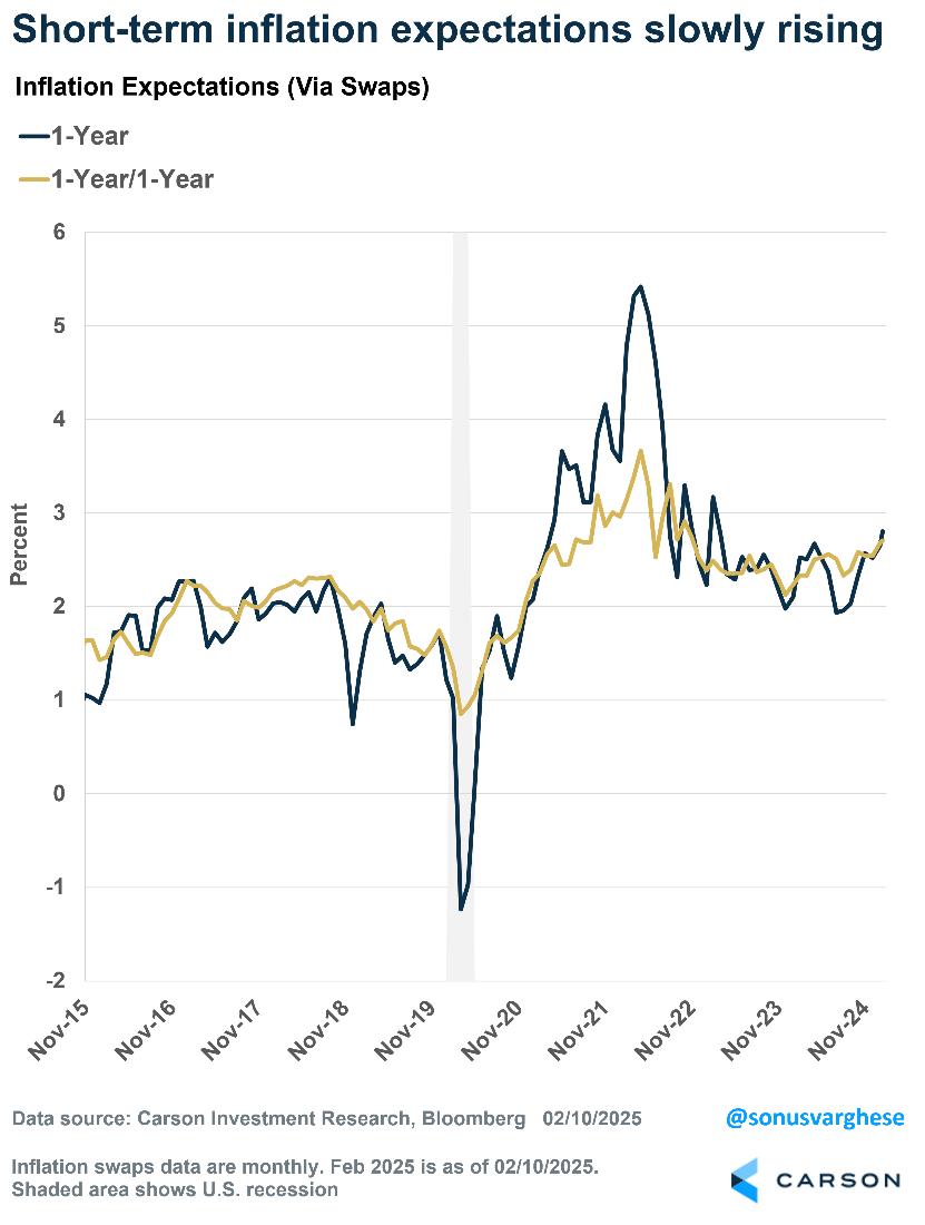 Market-implied short-term inflation expectations have also been rising recently, and markets are generally apolitical. 1-year ahead inflation expectations have moved up to 2.8%, the highest since March 2023. We also calculated 1-year/1-year forward inflation expectations, which is inflation expected in the second year from now (roughly 2026). That’s risen to 2.7%, the highest since November 2022. “Normal” levels, at least going back pre-pandemic levels, were around 2.2 – 2.3%. Again, what’s worrisome here is that these changes are not because of higher energy prices (which have hovered in a fairly tight range recently). Instead, this is likely where the tariff uncertainty is being manifested. Interestingly, we didn’t see a similar increase in 2018 – 2019 amid the trade war, but this time around markets may be sensitive to the fact that we’re in a generally higher inflation regime.