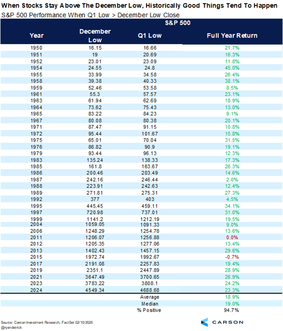 Interestingly, since 1950, stocks held above the December lows 38 times while they broke the lows 37 times. Talk about even-steven. Those are some pretty big sample sizes, and sure enough, the takeaway from the historical results is very clear.
