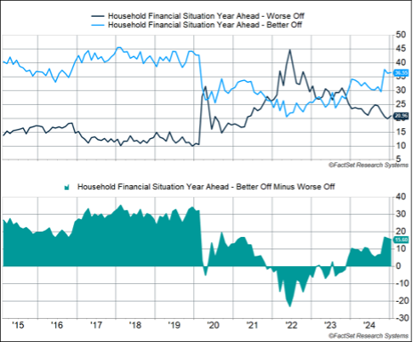 - 21% expect finances to be “somewhat worse off” or “much worse off” a year from now — down from 23.5% a year ago, but well above the 10.5% in February 2020.