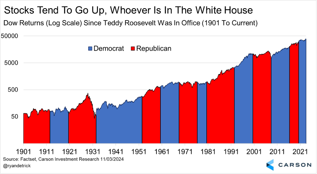 This is our last market commentary of 2024, and it may be the most important. The foundation of long-term investing success is understanding how markets behave in the long run. We share more tactical views as well, and they’re also important. In fact, in the second half of today’s commentary we look back at the recommendations we shared at the beginning of the year in our 2024 Outlook and how they turned out. (Our 2025 Outlook is coming out in just a couple of weeks!) But emotions can run high over shorter periods of time and that makes us all more vulnerable to poor decision making. Understanding the bigger picture helps tune out the noise, avoid some potential big mistakes, and stay on target to reach long-term goals.