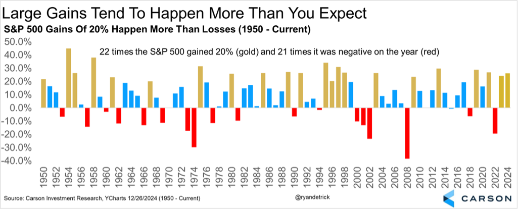 Another angle — after this year the S&P 500 will have gained more than 20% 22 times compared with an annual outright loss 21 times. In other words, the historical odds of a 20% gain are greater than a down year! Most investors aren’t prepared for this type of annual volatility, but it’ll help them if they indeed are.