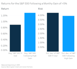 In addition to worrying about actual shots, some investors worry new highs or a sharp increase in stocks portend losses in the future. As seen in Figure 2, performance data suggest investors shouldn’t be any more worried than normal. Because there were only three monthly gains of more than 10%, we analyzed the returns in months following a gain of more than 5%. There have been 47 months since 1993 when the S&P 500 gained more than 5%. When this happens, stocks gain an average of 1.3% the following month, 0.4% higher than the average of all months over the same time period. Even more enticing, average volatility drops slightly.