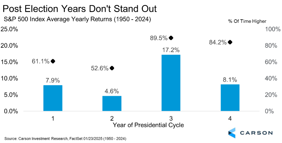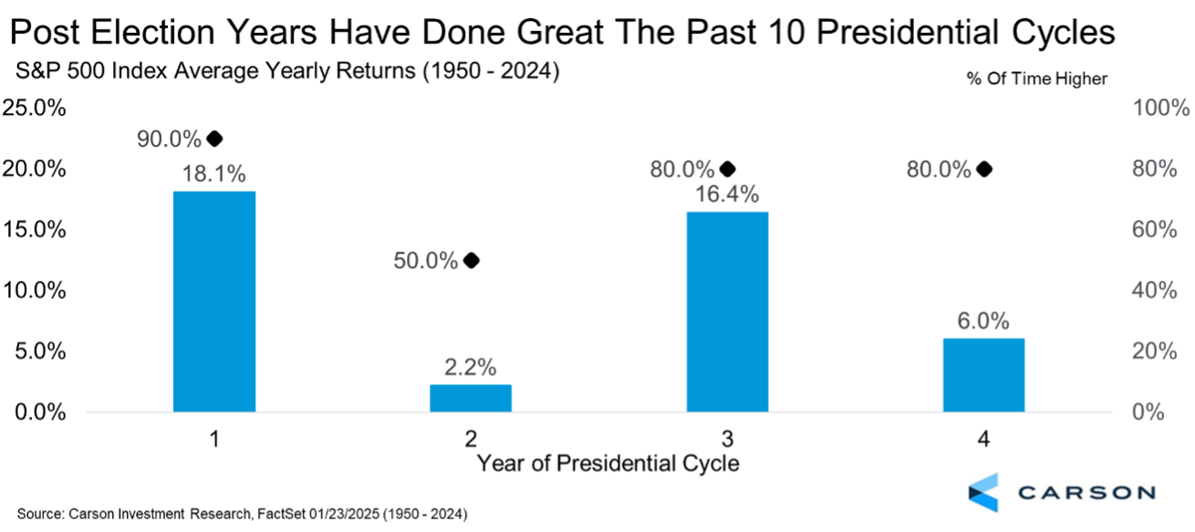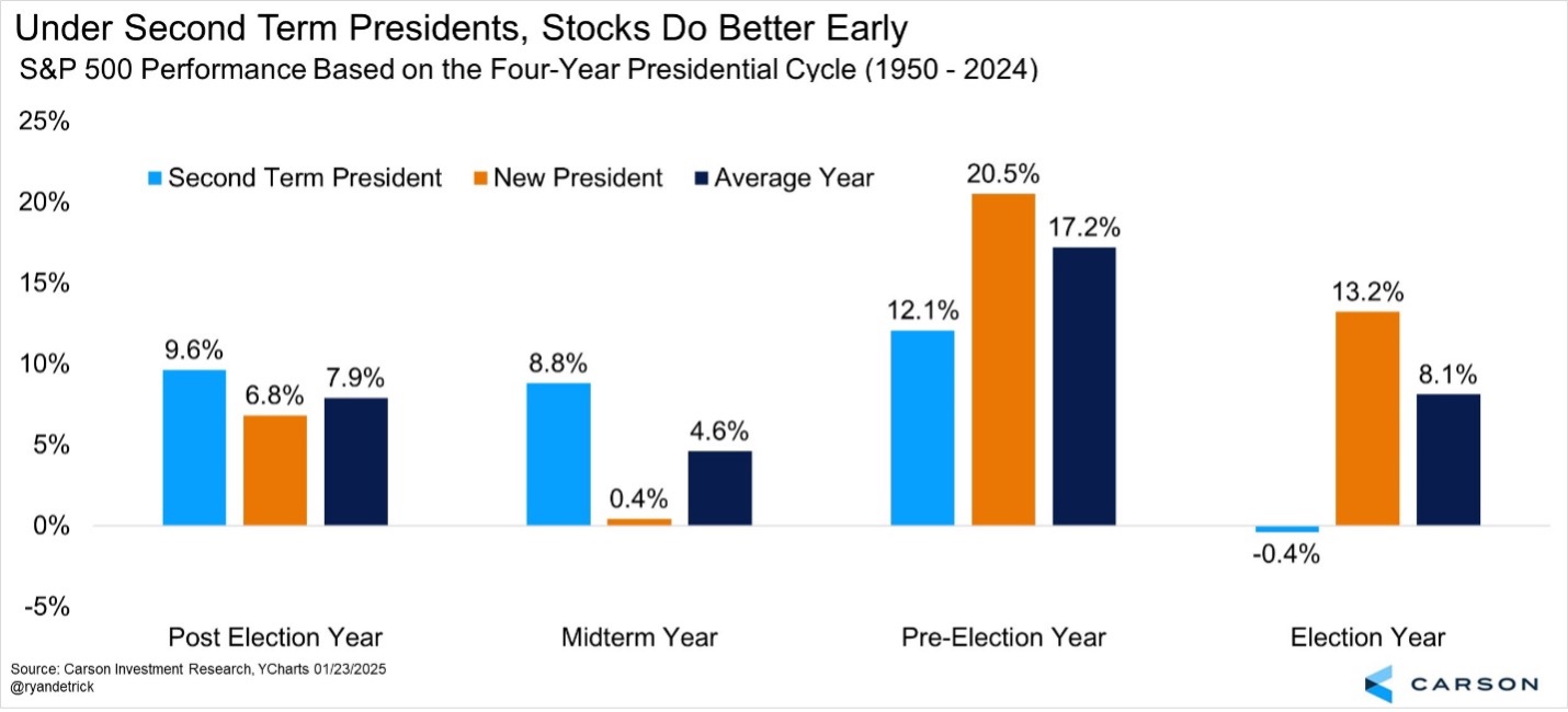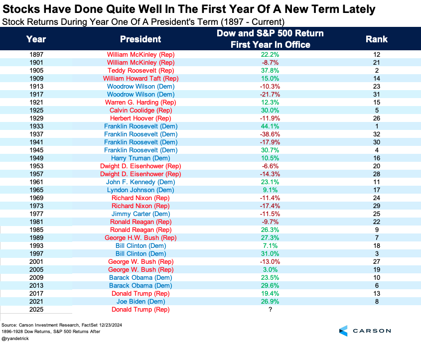 What about taking the extra step and breaking it down by whether there was a new president versus a president in their second term? Here we found that stocks once again do much better in post-election years under a second term president, yet another positive for 2025.
