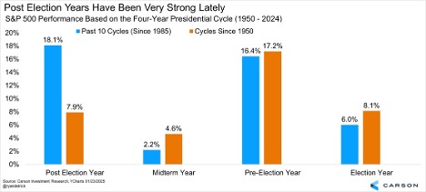 To put a bow on this discussion, here are the returns for the four-year presidential cycle since 1950 compared with the past 10 cycles. Post-election years are far and away the best performing year more recently.