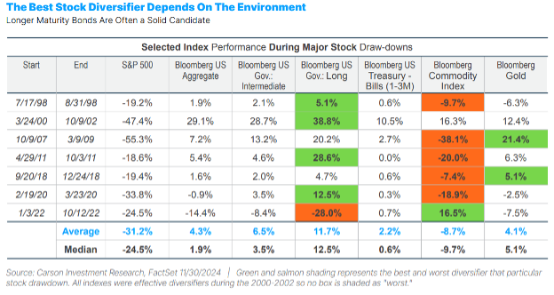 Looking back at the history of major stock declines, bonds — long-dated Treasuries in particular — have indeed often been one of the best diversifiers during stock selloffs, but not always. Broad commodities often see sharp declines during equity selloffs, but in 2022, commodity exposure was a far more powerful diversifier than fixed income. And gold was also a better diversifier than either during the Great Financial Crisis and in 2018. The point is that bonds, especially long maturity Treasuries, are often an effective diversifier during stock declines, but it does depend on the environment, and bonds aren’t the only diversifier.