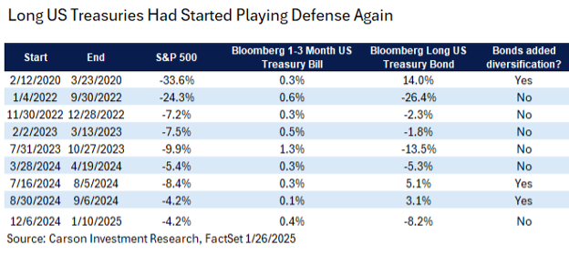 More recently we did see bonds start to return to their more typical role of bond diversifier but then were reminded of the conditions when they might not be. Looking at every S&P 500 decline over 5% starting with the pandemic, we can see that bonds were an effective diversifier in 2020, but then failed to outperform Treasury bills during every ensuing decline, five of them altogether covering 2022, 2023, and early 2024. Finally, during the more than 5% decline we saw in July and August of 2024, long Treasuries solidly outperformed Treasury bills and even offset much of the equity market decline. They did it again during the 4.2% stock decline in August and September.