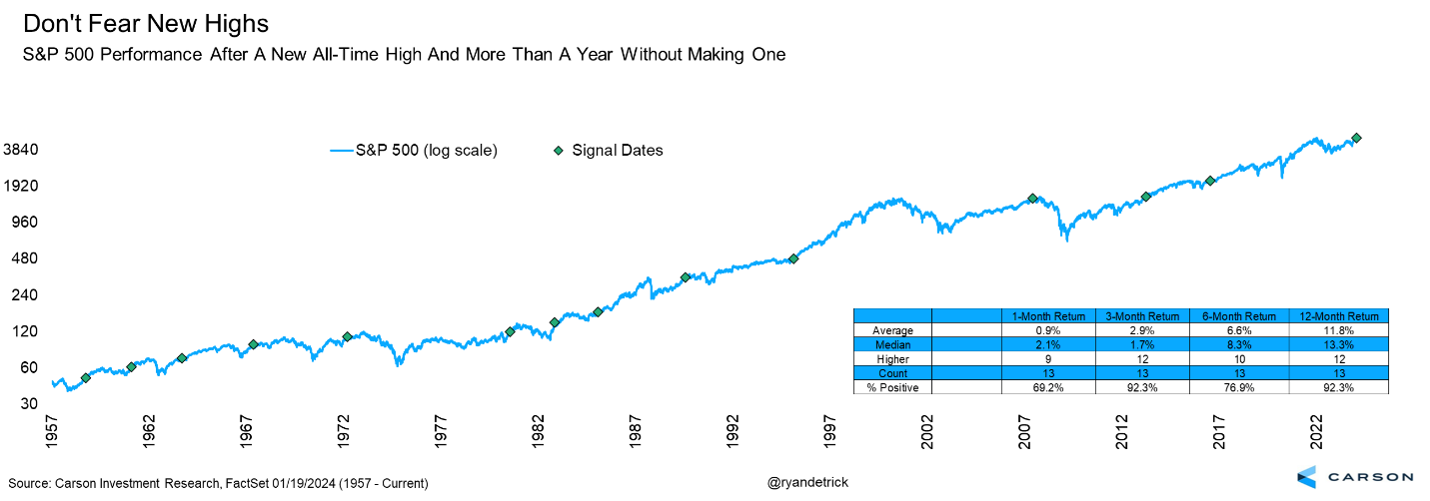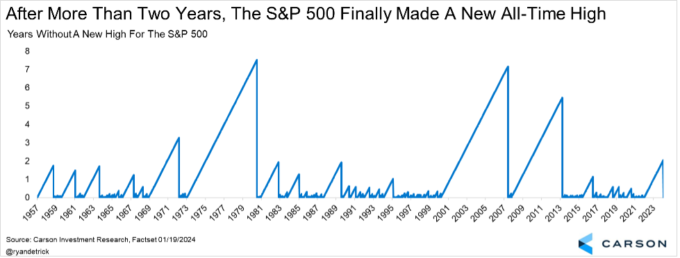 It took more than two years, but the S&P 500 closed Friday at an all-time high. The previous record high was set on Jan. 3, 2022. Of course, that was followed by a vicious 25% drop and a bear market, sparked by the war in Ukraine, supply chain challenges, a generational spike in inflation, China on lockdown, and the most aggressive Fed in four decades. That bear eventually ended in October 2022, and since then stocks have defied many experts, who continually (and incorrectly) touted a weakening economy, tapped-out consumer, and many other reasons to doubt the new bull market. Fortunately, we’ve been on the other side of the strategist consensus, as we’ve firmly believed stocks would surprise higher and the economy would remain resilient.