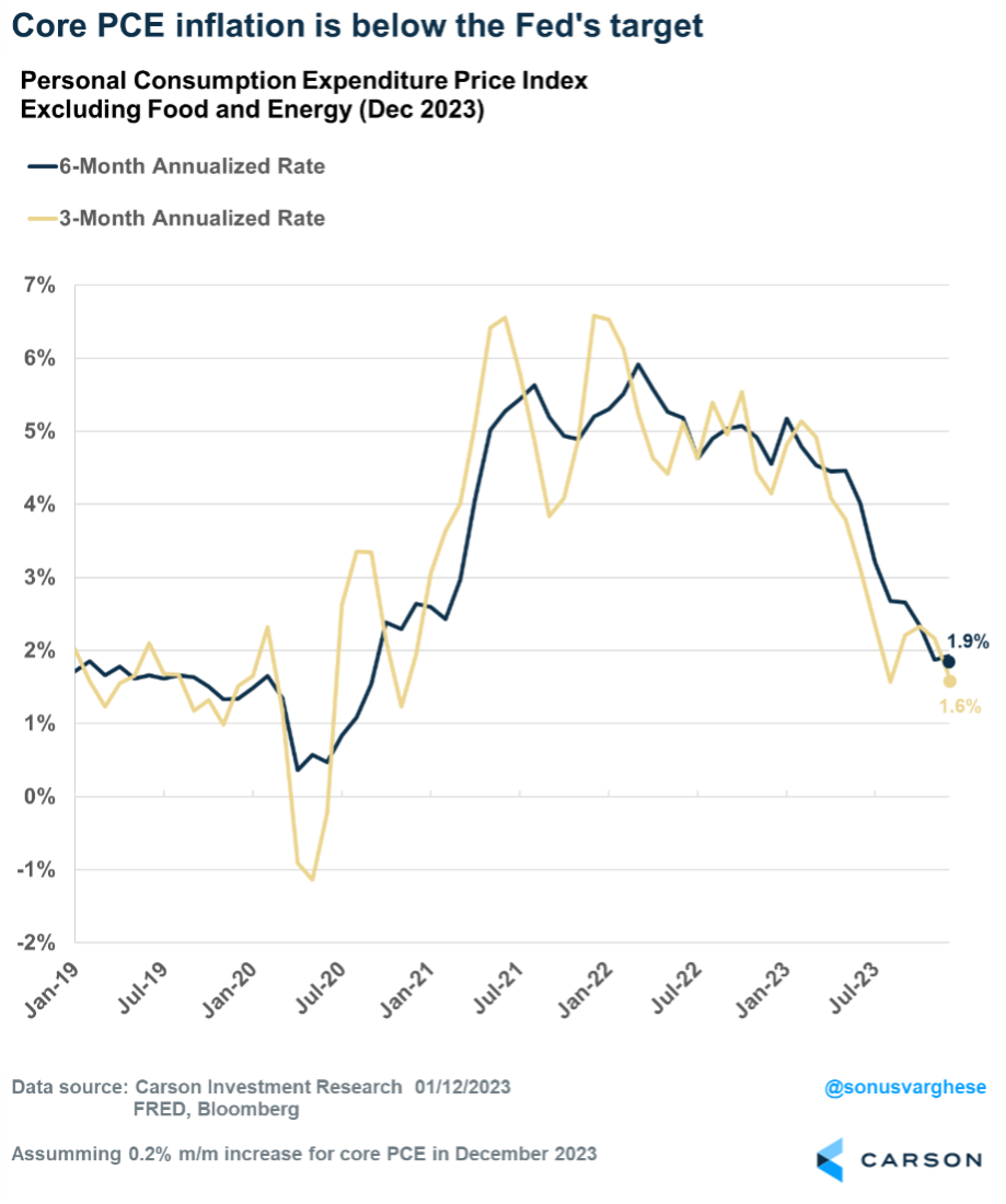 Coming into 2024, it seems fairly certain the Fed will cut rates. As we wrote in our 2024 Market Outlook, rate cuts are now on the horizon thanks to inflation easing back to the Fed’s target. In fact, at their December meeting, Fed members projected three cuts (each worth 0.25%) in 2024. This was based on their projection of core inflation, as measured by the personal consumption expenditures index (PCE), easing to 2.4% by the end of 2024. Since then, December inflation data for the consumer price index and the producer price index have indicated that core PCE is likely to rise less than 0.2% month over month in December. That translates to an annualized rate of 1.9% over the last six months and 1.6% over the last three months.