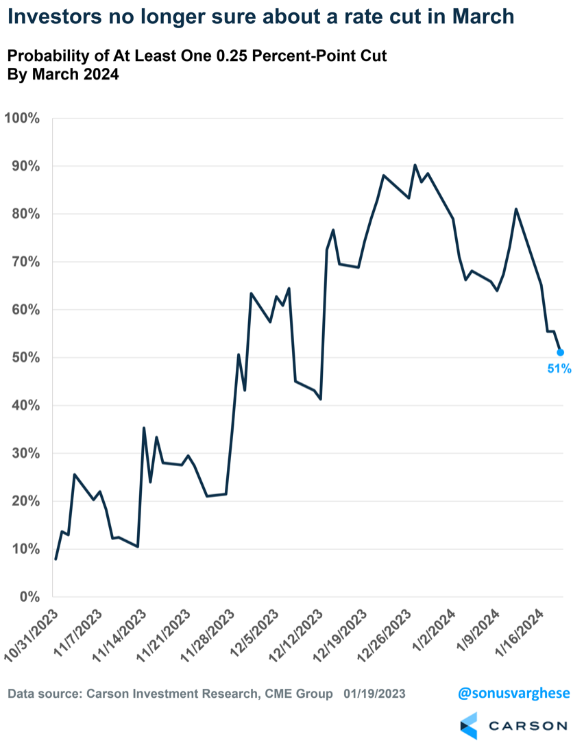 But these are not certainties. At the end of 2023, the probability of a cut in March had risen as high as 90%, and it pulled back to 67% last week. So, the odds have gone from a near-sure thing to closer to a coin toss.