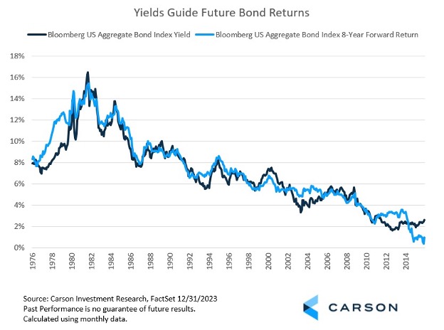 We at Carson Investment Research just released our 2024 Market Outlook: “Seeing Eye to Eye.” While our view on the economy leads us to favor stocks over bonds in 2024, we believe bonds are poised to return to their traditional roles as portfolio stabilizers and sources of diversification. As they normally do, bonds are again acting as a strong source of income, even at shorter maturities.