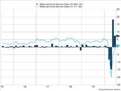 U.S. consumers are doing their part to put the economy back on track. As shown in Figure 1, retail and food services sales rose 7.5% on top of an upwardly revised 18.2% growth in May. Based on the rally, sales are up 1.1% over June 2019 after having dipped into negative territory. Normal growth has been 4-6%, so the number isn’t back to its typical level. But it is positive.