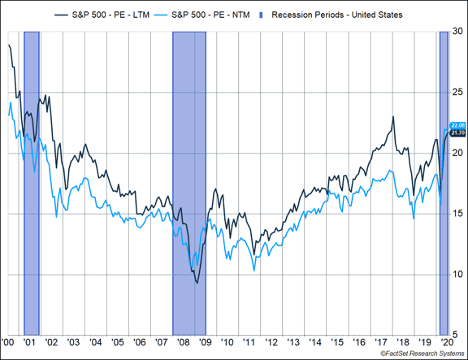 As earnings season kicks off in earnest this week, investors should be prepared to curb their enthusiasm. Second quarter earnings are expected to slump 44.8% compared to a year ago. If they fall nearly that much, it will be the worst decline since 2008. Investors appear to be looking past this quarter and are anticipating improvement in coming quarters. As figure 1 shows, the market gains and earnings decline has raised the price-to-earnings ratio above 22 for the first time since the technology bubble.