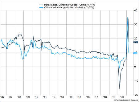 Two formerly fast-growing economic segments slowed down. In the U.S., existing home sales fell to 5.85 million last month as increasing prices and scarce supply are slowing sales. China’s retail sales increased 17.7%, and industrial production rose 9.8% (Figure 1). Both numbers missed expectations and indicate China’s economy isn’t bouncing back as quickly as some expected.