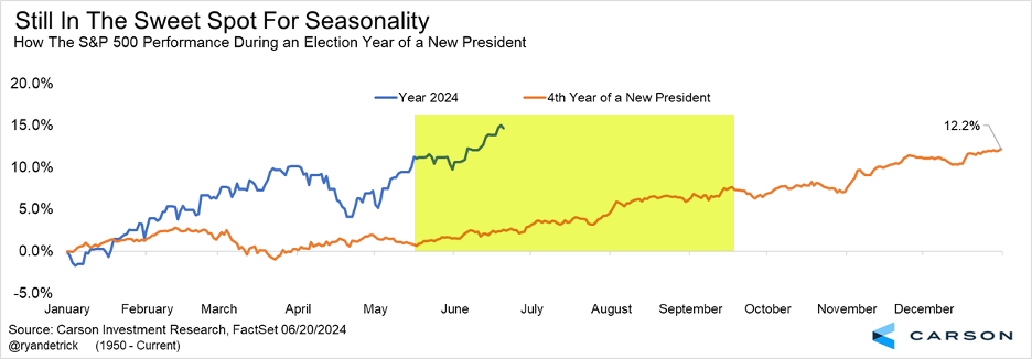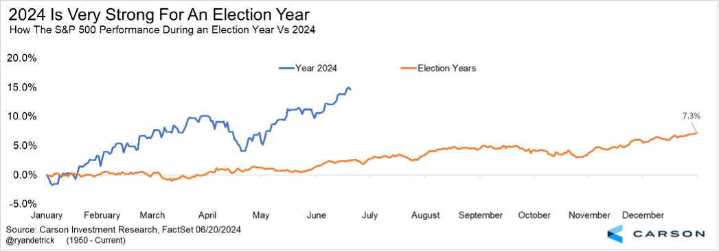 One thing that intrigues us is election years usually aren’t that strong early and tend to do better later in the year. In fact, only 1976 among election year was stronger at this point in the year, up 15.6% at the midway point. What happened next? Stocks added another 3% the final six months.