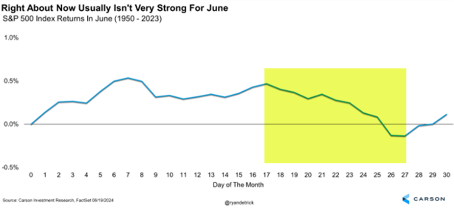 Now let’s be clear, stocks have been on a super strong rally lately. After gaining nearly 5% in May, stocks are up close to 4% in June so far. 1997 was the most recent year that saw gains of more than 4% in both of those usually tepid months, and stocks gained another 10% the rest of the year. But before we assume stocks will gain 4% in June, let’s be aware the month isn’t over yet and historically the latter part of June tends to be weak. After the run stocks have seen lately, some type of well-deserved break at some point before the end of the month would be perfectly normal.
