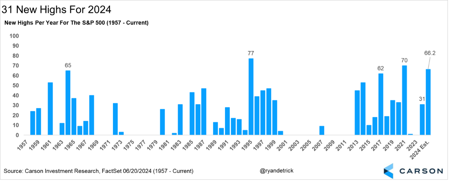 - More than 30 new all-time highs in a year has seen an average gain over the year of nearly 20%. 2024 already has 31 new all-time highs.