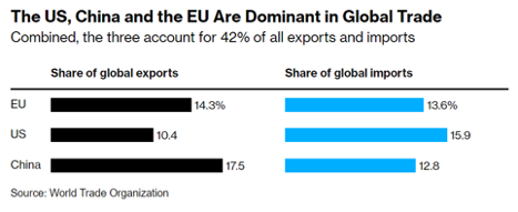 One, global trade is dominated by the US, China, and the EU. But it’s massively skewed, with the US importing much more than it exports. China is the dominant exporter, but even Europe exports more than it imports. All this means the rest of the world is awash in US dollars – which they receive in exchange for supplying Americans with goods. That’s actually a feature of how their economies work, which they rely on in many ways.