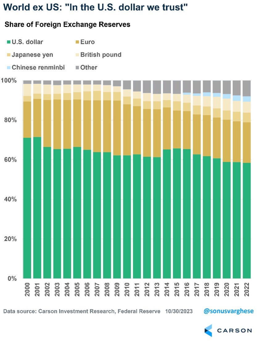 The second reason: The world has confidence in the US, and therefore the dollar. This is because the US has the deepest and most liquid financial markets, thanks to the size and strength of the US economy, open trade and capital flows with few restrictions, strong rule of law, property rights, and a history of enforcement. Despite the US making up 25% of the global economy, about 60% of global foreign currency reserves are in USD. It has fallen from 71% in 2000 but remains far ahead of other currencies as the decline in share has been spread across various currencies.