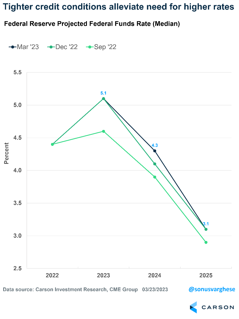 Market expectations for Fed policy rates immediately moved lower. Markets expected the stress in banks to translate to tighter credit conditions, which in turn would lead to slower economic growth and lower inflation.