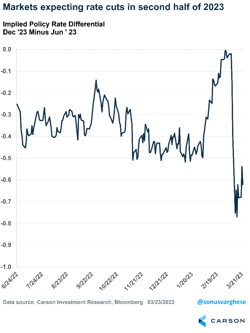 - Fed expectations move lower — if the banking sector comes under renewed stress, credit conditions tighten significantly and eventually lead to weaker data.