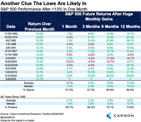 Last Thursday officially marked one month from the April 8 S&P 500 lows, and as bad as things felt back then, they’ve felt pretty good since. The S&P 500 soared more than 13% over the ensuing month. This was the best gain over a one-month period since we came off the pandemic lows in March 2020, and huge monthly gains like this are perfectly consistent with potentially higher prices going forward.