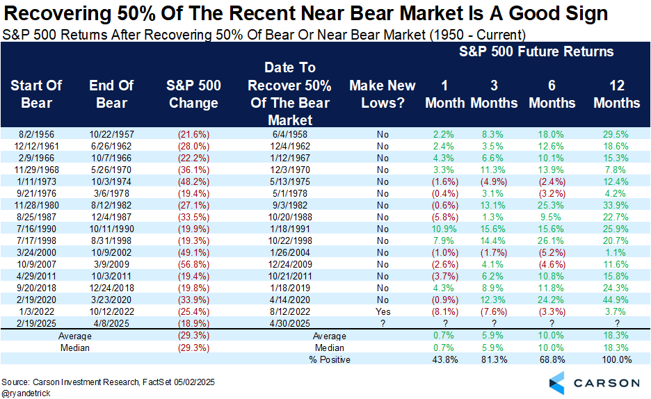 The good news is stocks have now recovered half of that near-bear market, potentially a good sign. In fact, looking at the past 16 bear or near bear markets only once did stocks go on to make new lows after half of the bear market was recovered. Of course, that was the very last time, in 2022, but this is still a good sign. Lastly, a year later stocks were higher an incredible 16 out of 16 times after recovering half of the bear (or near bear) market.