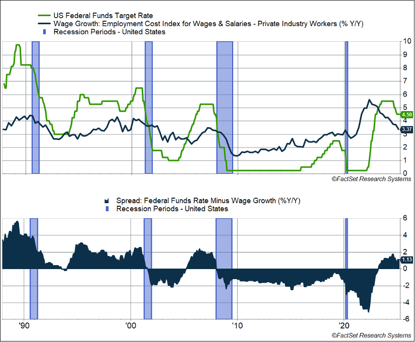Keep in mind that pausing on rate cuts does not just leave us with a benign status quo. Even without moving rates, policy is implicitly getting tighter because wage growth is easing. Historically, a fed funds rate sitting well above the pace of wages has constricted the economy and ultimately these situations ended up in recessions. The relationship between rates and wage growth matters even if rates stay steady.