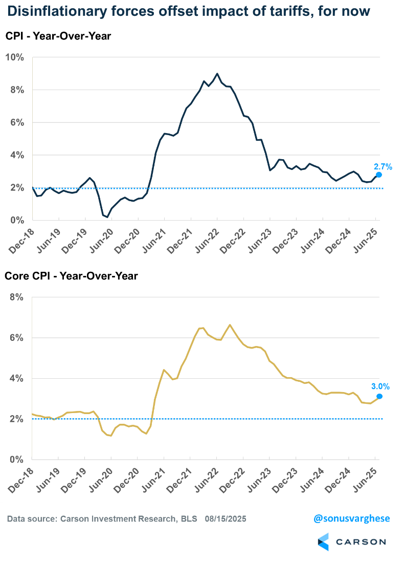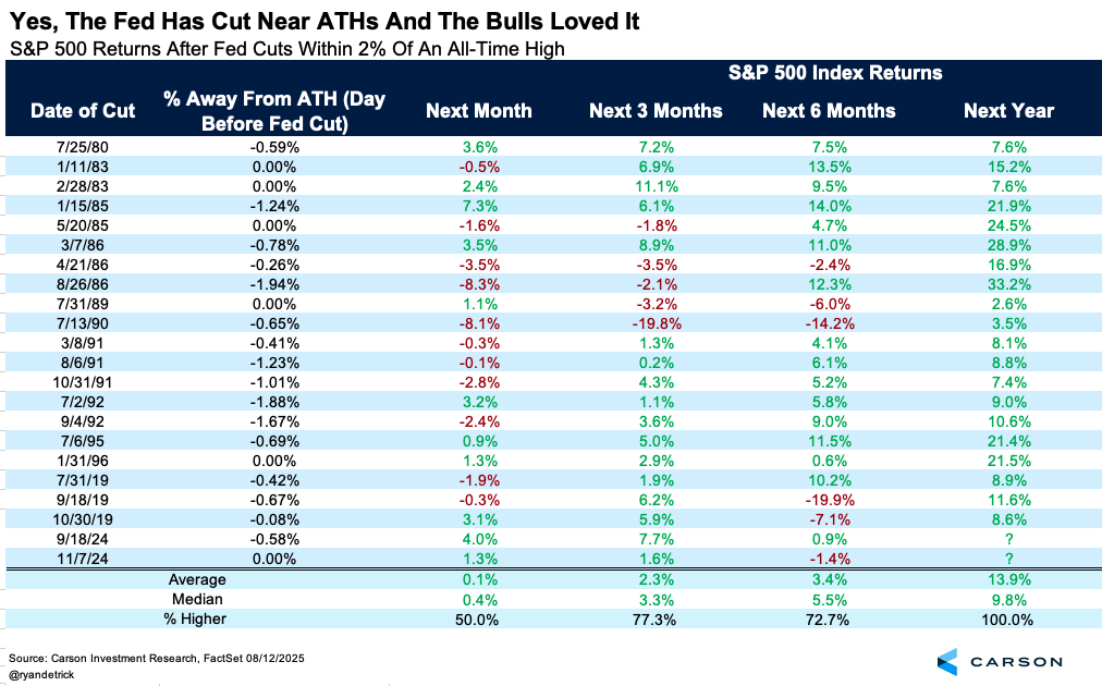 We will discuss the inflation data more below, but market-based pricing suggests there is currently a little less than an 85% chance of a rate cut at the next Federal Reserve Bank (Fed) meeting in four weeks. If you remember last year around this time, we noted that a rate cut with the S&P 500 near all-time highs is rather rare, but that doesn’t mean it isn’t possible. In fact, the Fed cut rates twice last year with the index near all-time highs (in September and November). The good news is rate cuts near all-time highs have seen stocks higher a year later 20 out of 20 times and when last year’s September and November 2024 cuts reach one year we could have 22 out of 22. In other words, if the Fed cut rates in September and the S&P 500 is still be near new highs, it could be another positive driver for stocks.
