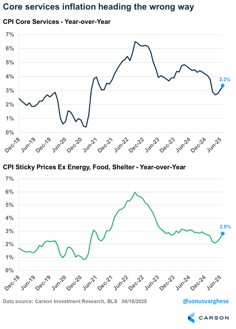Despite the market response, the overall inflation numbers were not so much good as not as bad as feared. Headline inflation climbed 0.2% in July to take the one-year number to 2.7%, while core inflation (ex-food and energy) climbed 0.3% to take the one-year number to 3.0%, a five-month high. Core inflation at 3.0% is still a long way off from the Fed’s target of 2.0%, and as you can see below, it’s moving in the wrong direction. Still, on the face of it, it looked like tariff-impacted inflation for goods was offset by disinflationary forces from shelter and that was reason for cheer.