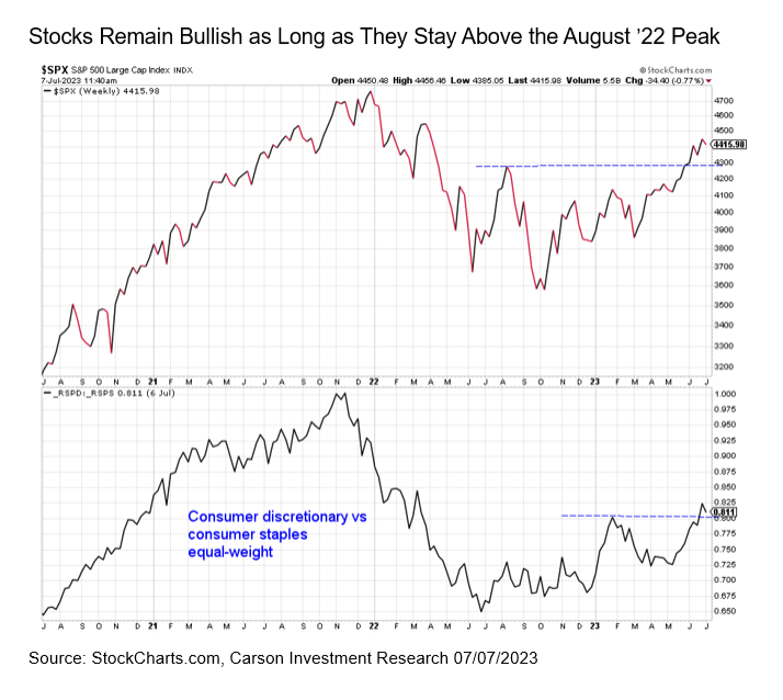 After a huge run-up in June, stocks have consolidated in July, which is perfectly normal. We continue to hear predictions of a stock market fall and economic recession, but we disagree with both assessments. Two data points indicate continued strength. The S&P 500 has not broken the August 2022 peak, and consumer discretionary is outperforming consumer staples. The latter is a sign of a healthy bull market, as it suggests a risk-on appetite. As long as discretionary stocks outperform staples and the S&P 500 remains above the August 2022 peak, the surprise summer rally likely has legs.