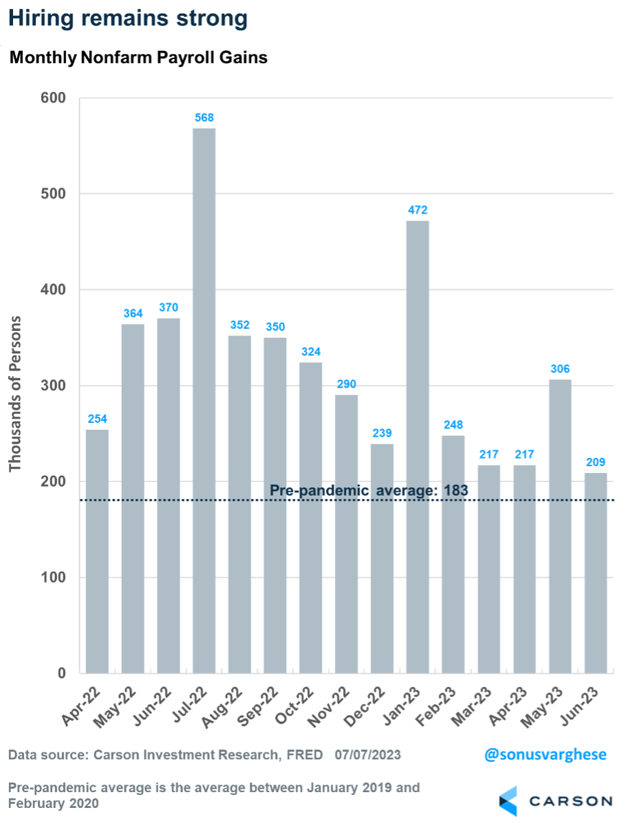 The June payroll report was solid once again. Payrolls grew 209,000 in June; monthly payroll growth has averaged 244,000 over the past three months. So far this year, the economy has created 1.67 million jobs. The unemployment rate dipped down to 3.6%, which is not far from 50+ year lows. In short, the labor market is healthy and that’s keeping incomes strong, which is positive for consumption going forward.