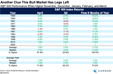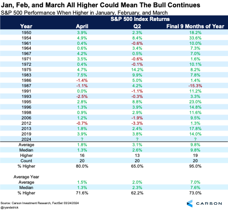 Stocks have ended each of the first three months of 2024 higher. When this has happened in the past, the final nine months of the year have been higher an incredible 19 out of 20 times! Adding to the fun, April and the second quarter also tend to do better than average.\\