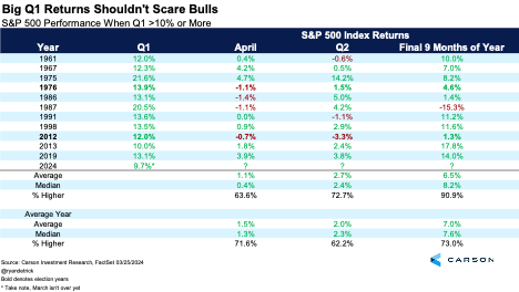 What about when the first quarter gained 10% or more? April and the second quarter did not perform especially well, but the rest of the year was higher 10 out of 11 times. The market was only lower in 1987. During that year, the market rose a record 20.5% by the end of the first quarter, which is a little different than the approximately 10% gain so far in 2024. The average took a big hit those final nine months due to the 1987 stock market crash, but the median was a rather solid 8.2%.