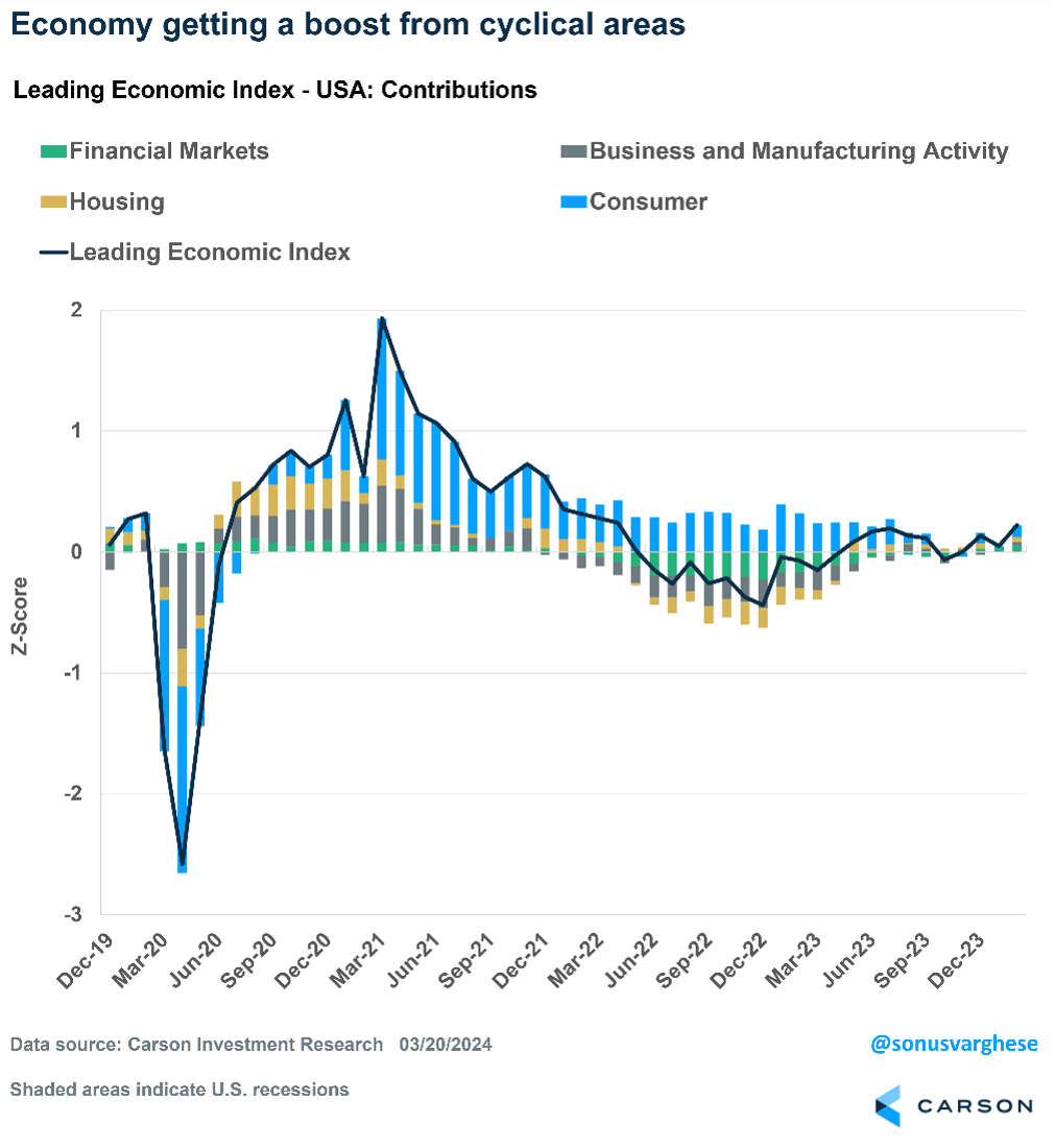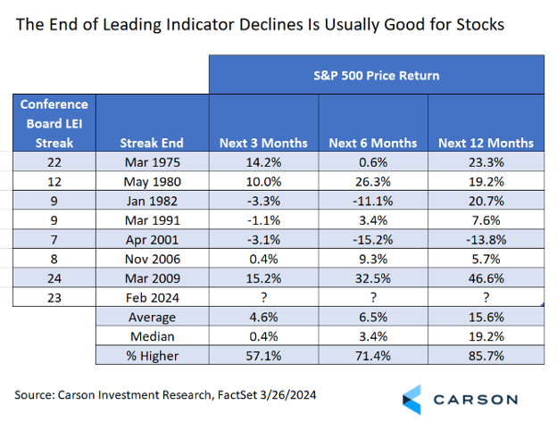 - Carson’s proprietary leading index, which pays more attention to consumer spending patterns and never signaled a recession, continues to have a more optimistic outlook than The Conference Board.