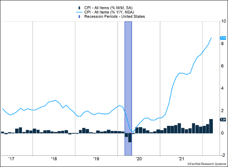 Inflation is starting to feel like a winter that just won’t give way to spring. The Consumer Price Index (CPI) climbed 1.2% last month and has now risen 8.5% in the last year (Figure 1). Energy and food prices were the main culprits, contributing 80% of the overall increase. Food prices jumped 1.0% and have now risen 8.8% in the last year. Used car prices declined last month, otherwise the data would have been worse. The decline in used car prices helped contain core CPI, which excludes food and energy and only increased 0.3%. Housing, airfares, and lodging were all contributors to higher prices.
